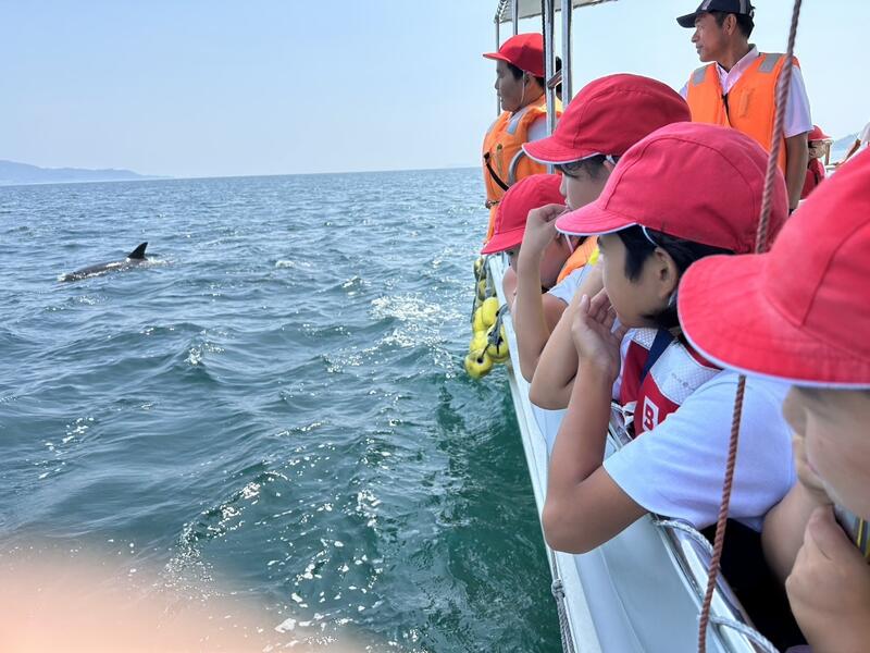 天草市のイルカとの共生の町づくり事業として五和町のイルカウォッチングを体験しました。天気に恵まれ、青空と青い海の中を悠々と泳ぎ回るイルカを見学し感動の声をあげていました。