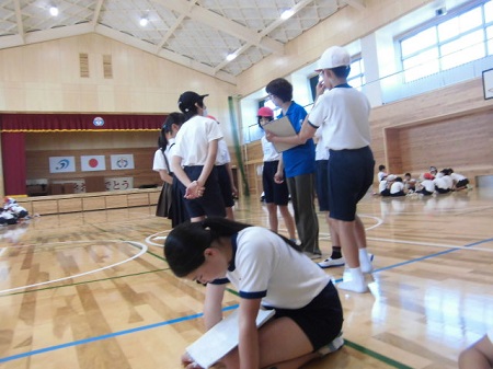 写真は、準備のあと体育館で係ごとに打ち合わせをしているところです。