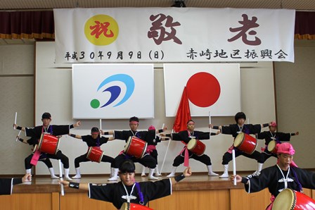 赤﨑地区の敬老会では「琉球國祭り太鼓」も見てもらいました。