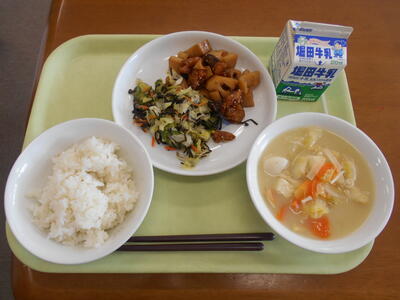 今日の給食は、『麦ご飯、中華うま煮、ししゃもフライ、中華あえ』でした。カリッとあがったししゃもフライ、野菜がたっぷり入った中華うま煮、どちらもご飯が進むメニューでした。そして、なぜか、うま煮に大好きな「うずらの卵」がたくさん入っていて嬉しかったです。
