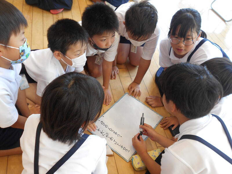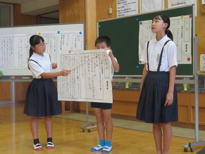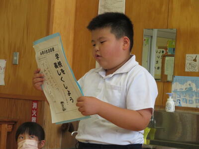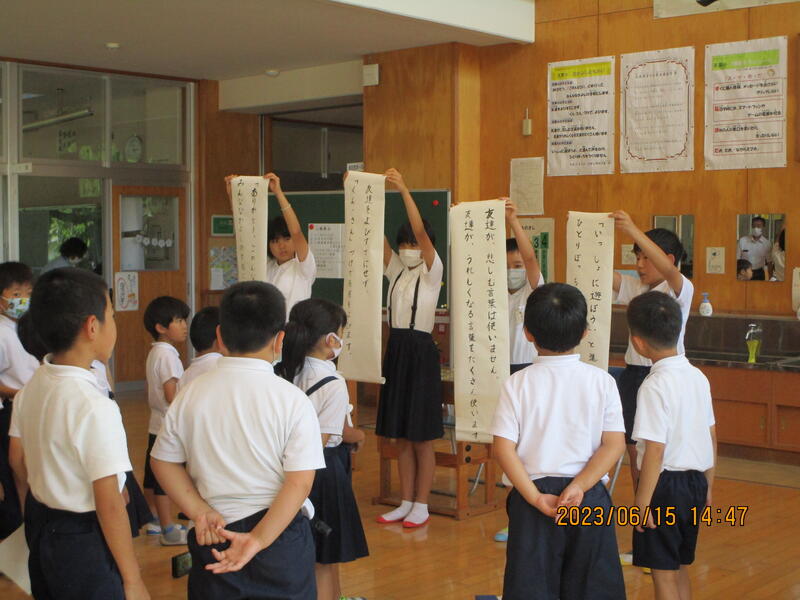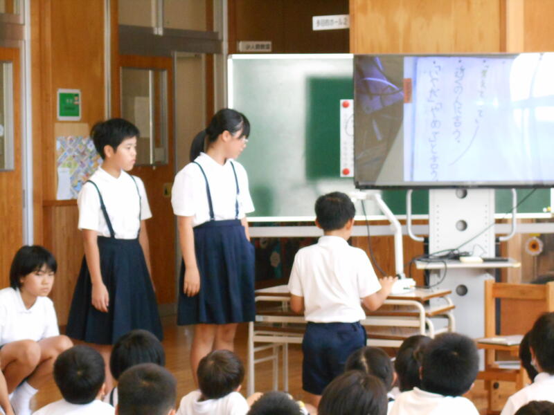 今日は、人権集会でした。天草人権擁護委員協議会の方に来ていただき、「プライベートゾーンは大切」という紙芝居をしていただきました。その後、縦割り班ごとに6年生を中心に話し合いをしました。低学年も自分の感じたことを積極的に発表していました。その後、全体で振り返りをして、最後に天草小開校時に作られた「なかよしの誓い」をみんなで読み上げました。自分も人も大切にすることの大切さに気づけたようです。
