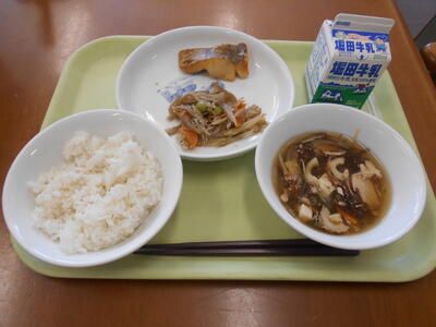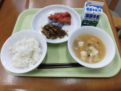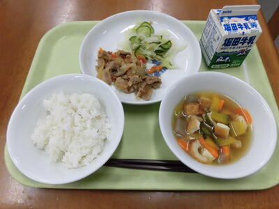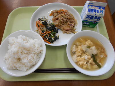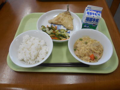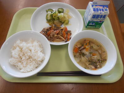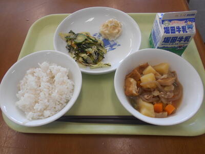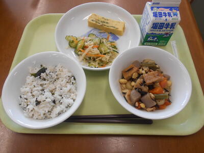 5月29日の献立は『わかめごはん、大豆の磯煮、ちぐさやき、切り干し大根の酢の物』でした。子供たちにも人気の「わかめごはん」は、かすかな塩味と磯の香りが食欲をそそります。その上に、厚揚げやてんぷら、ひじきなど様々な具がたくさん入った磯煮のおかげで、ご飯がすすみました。そして、栄養たっぷりの切り干し大根の酢の物。切り干し大根は乾燥させることで、生の大根よりも栄養価が高く、特に食物繊維が豊富なため、おなかの調子を整えるはたらきがあるそうです。今日も、食欲もしっかりと満たし、栄養面もしっかりと考えられた給食ありがとうございました。