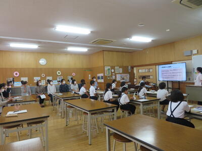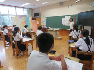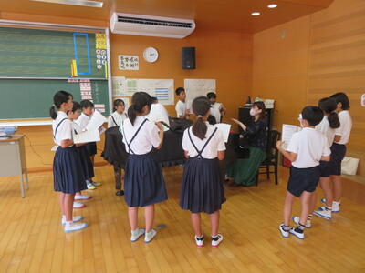 音楽の授業です。レクイエムプロジェクト長崎in天草に向けて練習をしています。一年生も2年生をお手本に、福連木の子守唄や碧の子守唄を頑張って歌っています。授業の後半はわらべうたを歌って楽しんでいます。