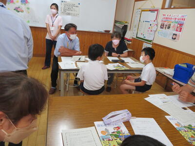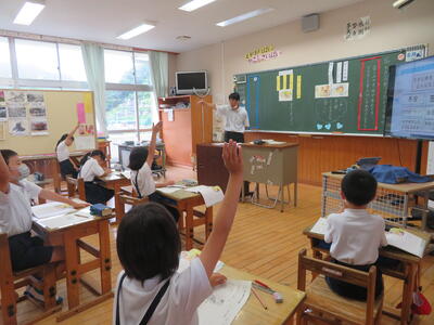 今日は2年生の国語の授業を先生たち全員で見ました。学習課題は、「どうしてスイミーは元気をとりもどしたのだろう」。前の場面ですっかり元気をなくしたスイミーが、海のいろいろな生き物を見て、元気を取り戻している場面を読み取り想像力を広げる学習です。子どもたちは、身体表現でいそぎんちゃくやうなぎなどを表し、それを見たスイミーの気持ちを想像しました。次から次に手を上げ、学習リーダーさんが指名し、たくさんの考えを交流することができました。2年生はのびのび意見が言え、体での表現も、とても上手です。