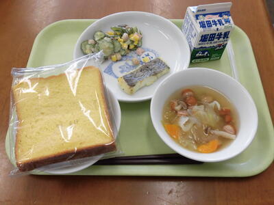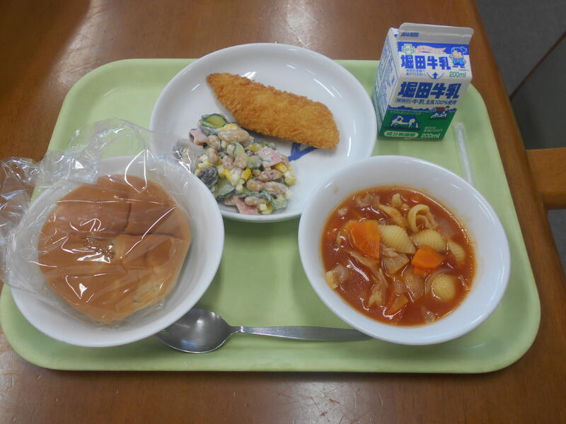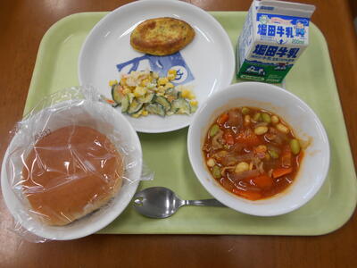 5月30日の献立は『パインパン、ミネストローネ、白身魚フライ、ビーンズサラダ』でした。「ミネストローネ」は、「具だくさんのスープ」と言う意味で、イタリアの野菜スープだそうです。トマトの酸味としっかり煮込まれた野菜の甘みがマッチし、とてもおいしいスープでした。ビーンズサラダには、大豆、大福豆、金時豆など豆類がたくさんはいっていて、栄養価の高いサラダになっていました。そして、いつもサクサクにあがった揚げ物は、白身魚のフライ。あと一枚食べたくなってしまいました。今日もおいしい給食有り難うございました。