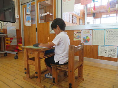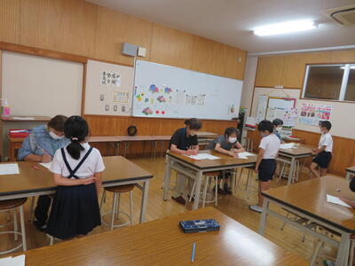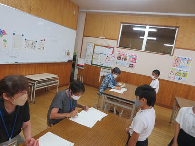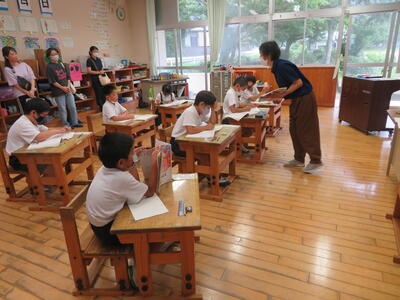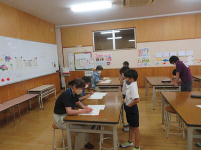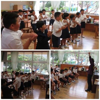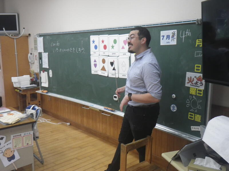 7月4日、1・2年生も、カズヒロ先生と一緒に、色を英語で話す勉強をしました。