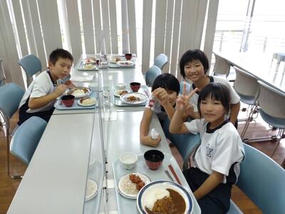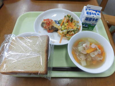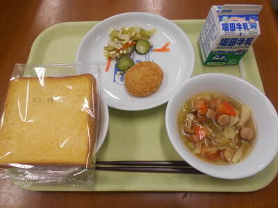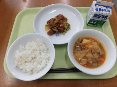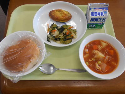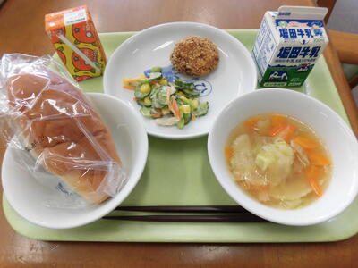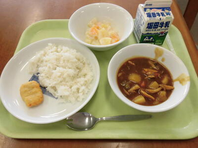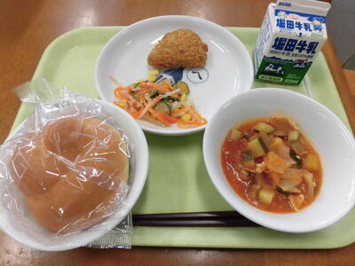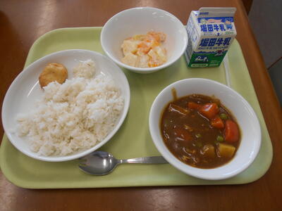 6月1日の献立は『かぼちゃパン、カレースープ、大豆とゴボウのミンチカツ、イタリアンサラダ』でした。6月は、食育月間となります。栄養士の先生からも食事のマナーを意識しながら、毎日の給食時間を過ごして欲しいというメッセージをいただきました。今日も子供たちの大好きなウインナーがたっぷりはいったカレースープ、大豆とゴボウの食感がおいしいミンチカツ、新鮮な野菜がたっぷりのイタリアンサラダ、どれもおいしくいただきました