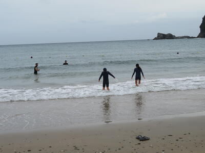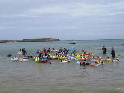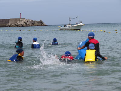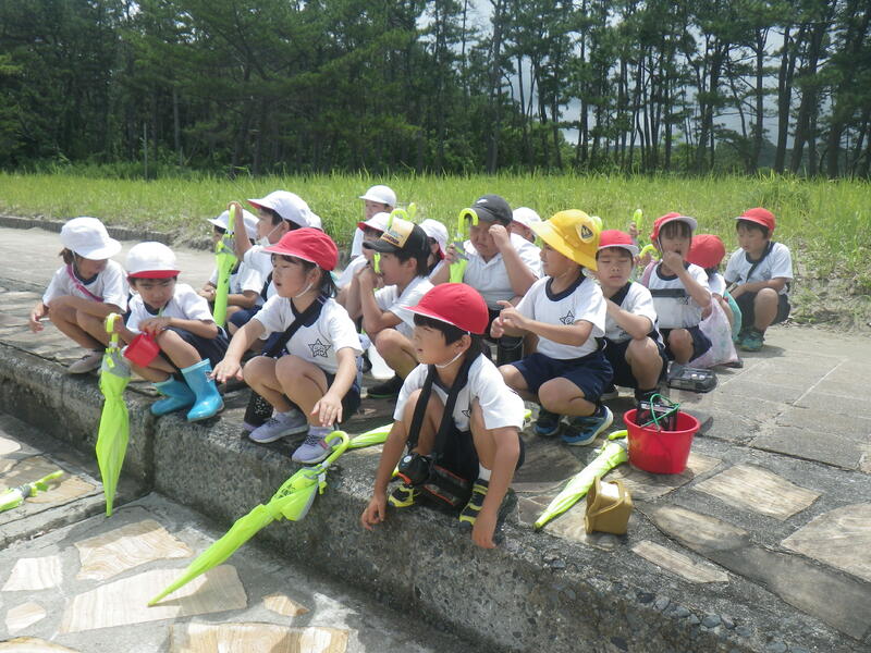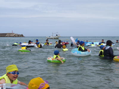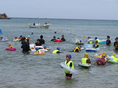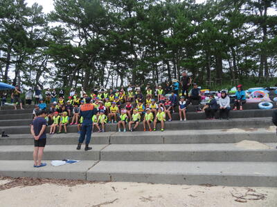 今日は待ちに待った海遠足でした。心配していた天候にも恵まれ、天草町の自然白鶴浜での海水浴を満喫しました。本日も保護者の皆様には、海の中から、船の上から、陸からしっかりと見守っていただき安全に実施することができました。まずは、天草広域連合南消防署天草分署の二名の消防士の方から、水難事故防止講習会を実施していただき、海の事故を防ぐために大切なこと、命を守るために大切なことを教えていただきました。その後、多くの皆様に見守っていただきながら、安心して楽しく海水浴を楽しみました。ご協力いただきました皆様に深く感謝申し上げます。