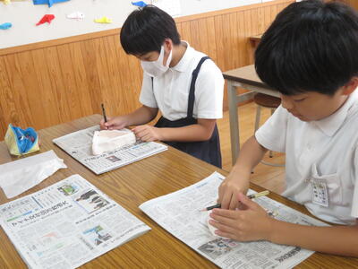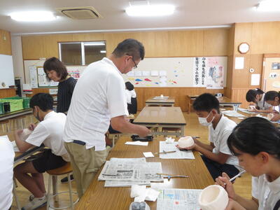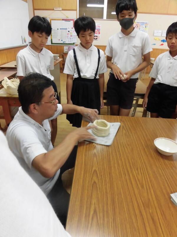 高浜寿芳窯の古田寿昭様が来校され、素焼きを終えた子どもたちの作品を持ってこられました。今日はいよいよ絵付けです。