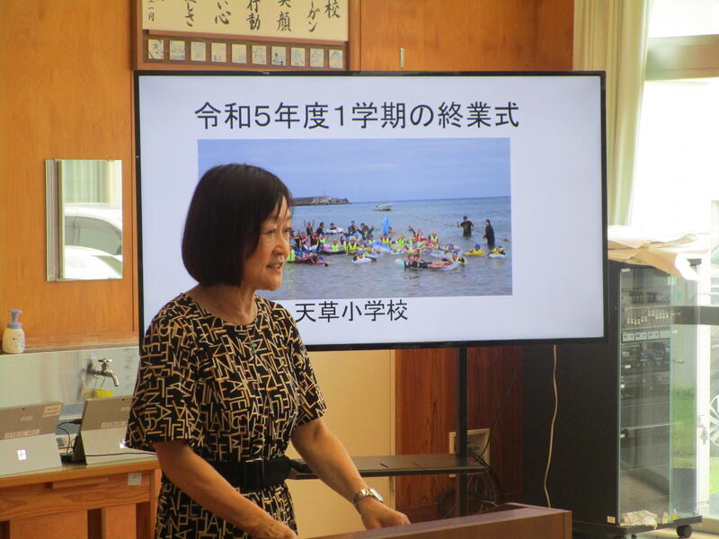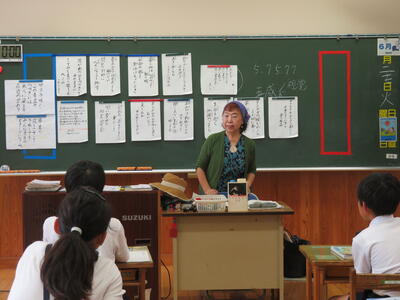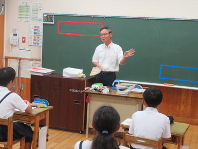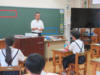 天草町まちづくり協議会会長の田中光徳様に来校いただき、天草町高浜の上田家にまつわるお話をしていただきました。天草町高浜の上田家は、江戸時代、代々高浜村の庄屋を勤めた家だそうです。天草高浜村を守り育てた方々の文化などが、今も続いている部分があるなあと感じました。田中様、6年生の教室で丁寧にお話くださりありがとうございました。