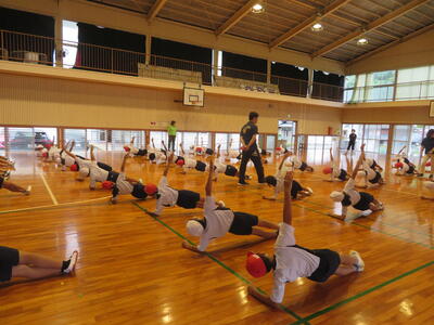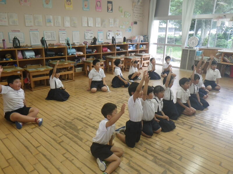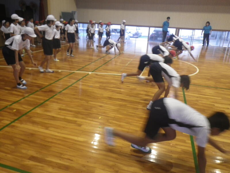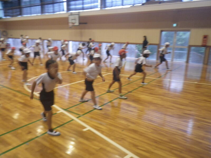 今日は朝から全校児童体育館に集まって、筋力、俊敏性を高める運動に取り組んでいます。