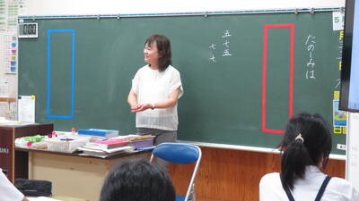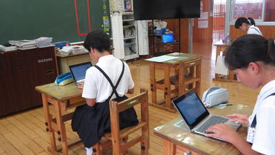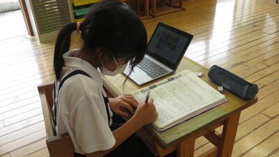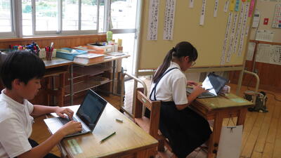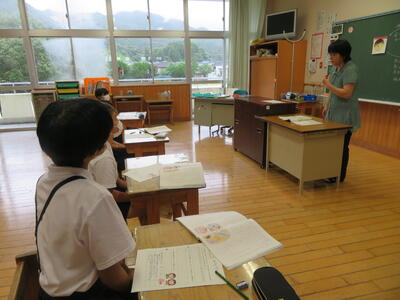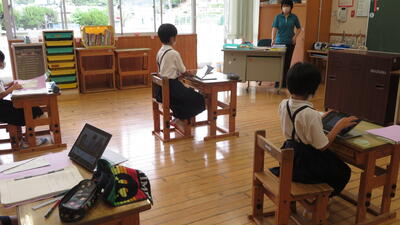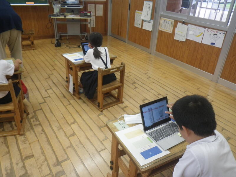 7月7日(金)1年生と2年生は、ICT支援員の津末さんにタブレットの使い方を教えてもらいながら勉強しました。