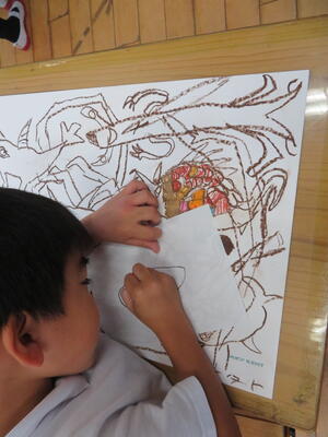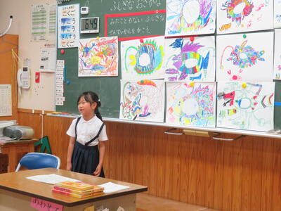 1年生の図工の授業の様子です。今日は伊野博子先生からクレパスを使った絵の描き方を教えていただきました。新しいクレパスを使って、大きな画用紙に思い切って自分の想像する不思議な魚を描きました。以下の写真は児童の様子です。授業の最後には、友達の絵のいいところを発表しました。次の図工で絵を仕上げます。