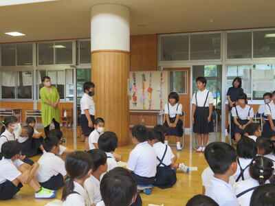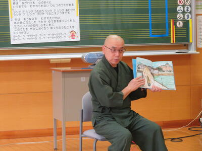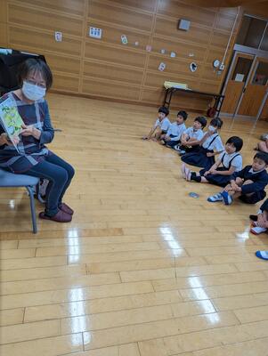 (読み聞かせ)今日は下田の中村さんが、1,2年生に絵本を読んでいただきました。「そらまめくんのベッド」を聞いて児童は「ベッドを貸してあげたところがやさしいなあと思いました。」等と感想を述べていました。