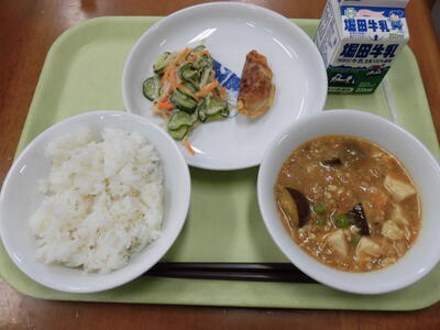 7月5日の献立は、『麦ご飯、マーボーなす(ちゃんと豆腐も入ってました)、餃子、バンバンジーサラダ』でした。今日は、子供たちに人気の中華メニューでした。今日は、2年生担任の先生が出張だったため、2年生の給食の様子を見に行きました。給食のおいしさを言葉で伝えようと思いましたが、子供たちのおいしそうに食べる様子を見てもらうのが一番ですかね。満面の笑みを浮かべ、おいしそうに食べている顔、なんとも幸せそうです。