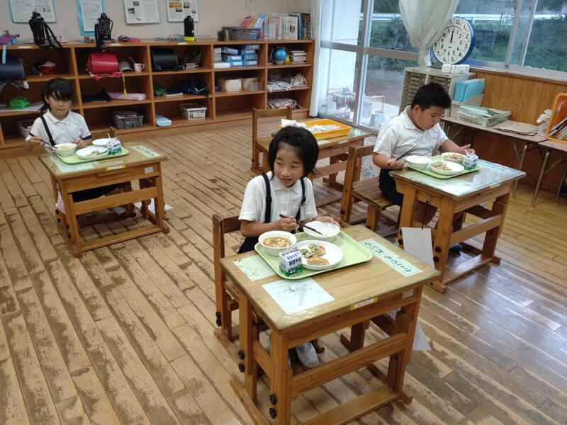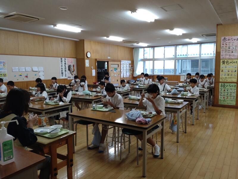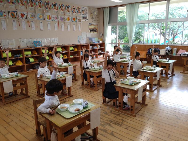 今日は、1年生の給食の様子を見に行きました。みんな行儀良く静かに食べていました。みんな静かに食べていましたが「給食おいしい人~?」とたずねてみると、みんな一斉に元気よく手をあげていました。本当においしそうに食べていましたよ。