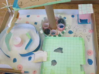 図工室に行くと、何だか楽しそうな声が・・・。「ころころガーレ」みんなが転がしたくなるコースを考えて作品を作りました。