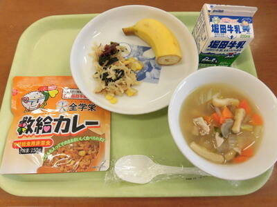 7月6日の献立は『救急カレー、ストックサラダ、だご汁、バナナ』でした。51年前の7月6日天草大水害が起こったそうです。大きな災害が起こった日に、災害が起こった時への心構えを学ぶことはとても大事だと思いました。確かに、非常食は、日頃食べている食事と比べればおいしいとは言い難いですが、命をつなぐ大切な食事であるということを考えておかなければなりませんね。今日は、災害に備えることの大切さや平和な日常への感謝を感じることができました。大雨で被害を受けられた方々が一日でも早く日常を取り戻されることを心からお祈りします。