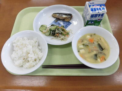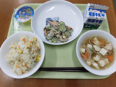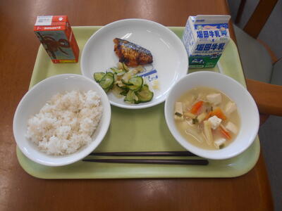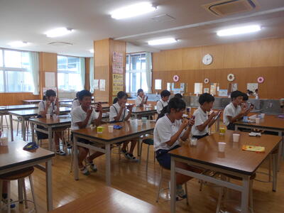7月7日の献立は『麦ご飯、夏野菜の味噌汁、いわしの梅煮、ちくわと野菜のごま和え』でした。雨が続いているためか、湿度が高く、クーラーなしでは居れない日が続いています。こんな時は、何となく食欲もわかないものですが、今日も給食はおいしくいただきました。95%は水分でできていると言われるキュウリのサラダ、大好きな夏野菜がたっぷり入った味噌汁、そして、栄養豊富ないわしの梅煮、暑い夏を乗り切るために必要な要素を考えて頂いていることを感じる給食でした。ありがとうございます。