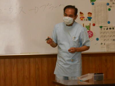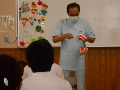 学校歯科医の森口先生(森口歯科医院)に歯のみがき方をご指導いただきました。まだ永久歯が生えそろっていない人は歯垢がつきやすいようです。歯列も歯垢のつき方に大きく影響しています。歯の一本一本を丁寧にみがく必要があります。みがきかたのポイントを教えていただきました驚く・ビックリ