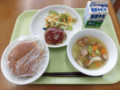 7月11日の献立は『米粉パン、コンソメスープ、ハンバーグ、大豆とじゃこのサラダ』でした。今日は、何といっても調理員の方々が一つ一つ心を込めて作ってくださったハンバーグは美味しかったです。みんな大好きなハンバーグですが、水泳記録会が終わって、おなかペコペコ状態で食べたハンバーグは最高でした。