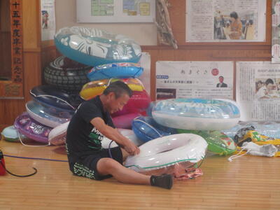明日の海遠足に持っていく浮き輪が集まりました。空気入れにはかなり時間がかかり、