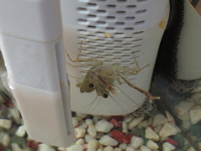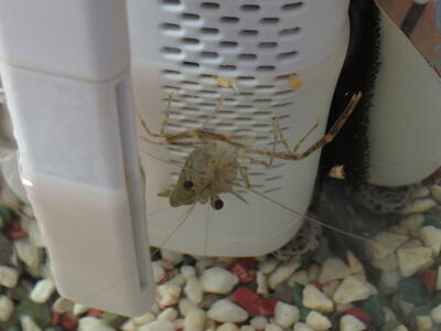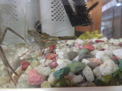 水槽の中のテナガエビ(ダクマ)くんです。手を使ってえさを上手に食べています。