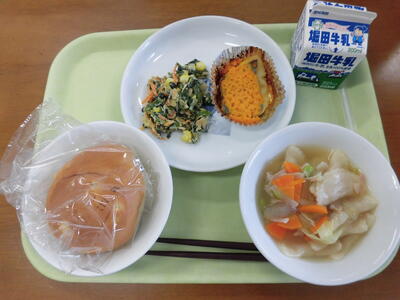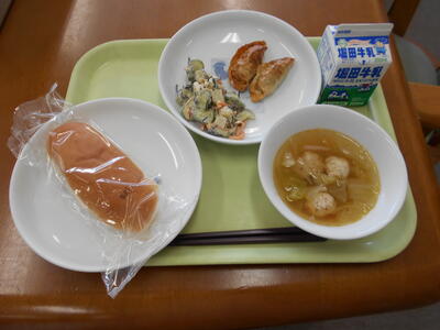 今日の給食は、キャベツと肉団子のスープ、ひじきポテトサラダ、餃子、コッペパン、牛乳です。餃子が日本に広まったのは、昭和初期に中国に住んでいた日本人が日本に戻り、中国で食べた餃子を懐かしんで日本でも作るようになったのが始まりです。中国では入れていないニンニクを入れるなどの改良をして、今の餃子が完成したそうです。