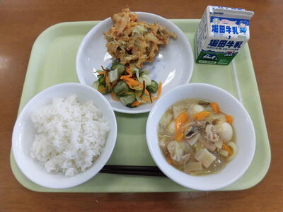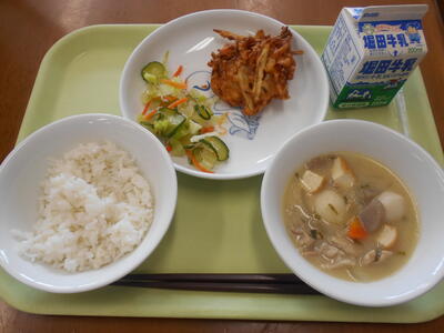 6月9日の献立は『麦ご飯、豚汁、かみかみあげ、ちりめんあえ』でした。「かみかみ・・・」と言うだけあって、かみごたえのあるかき揚げは、しっかりかむほど味があり、おいしかったです。豚汁は、ホクホクとしたさといもが味をひきたてていました。そして、大好きなサラダは、やっぱり今日もおいしかったです。