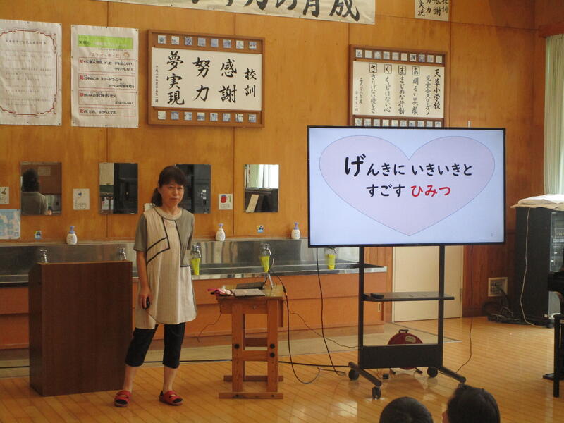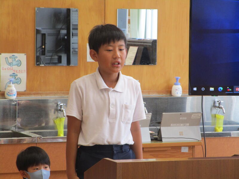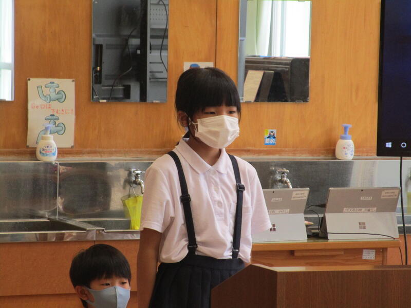 今日は保健環境委員会の発表で「環境」について考えました。天草小環境ISО宣言の4項目も紹介し、みんなが取り組めることを具体的に紹介しました笑う