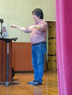 午後からは志柿コミュニティセンターで、6月4日天草市民センターで行われるレクイエムプロジェクトコンサートの練習が行われていました。天草小学校もそのステージに上がり合唱します。以下の写真はその練習風景です。作曲家の上田益(うえだすすむ)さんがご指導されていました。