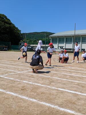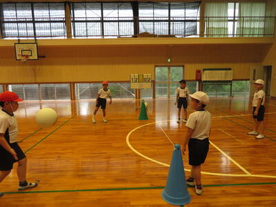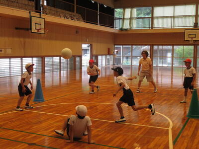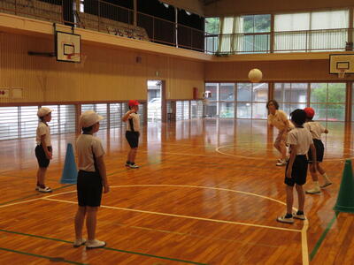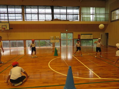 ソフトバレーボールのようなスポーツ「プレルボール」のルールを守って体育を楽しんでいる3年生です。
