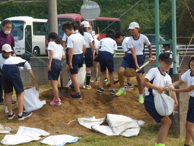 放課後に4・5・6年生と職員で、テントの組み立てと土嚢作りをしました。運動会へ向けて着々と準備が進んでいますにっこり晴れ