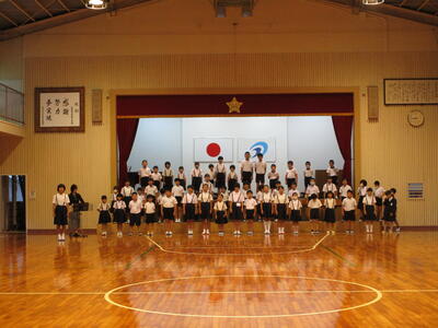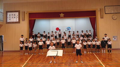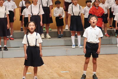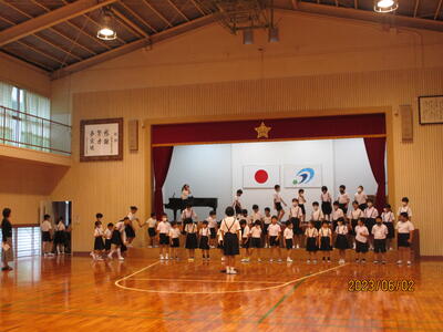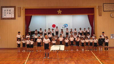 朝の歌声タイムを体育館で実施しました。全校児童で心を込めて歌います。