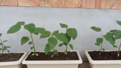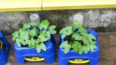 こいこい池では「タイサンボク」の花が美しく咲いています。ひまわりの苗も大きくなりなじめました。低学年の子供たちは、「ミニトマト」「なす」「とうもろこし」を育てています。おいしい野菜ができるといいですね。一年生は朝顔の種を植えました。芽が出てふた葉が出ました。大きくなるのが楽しみですね。