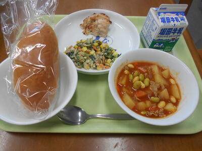5月18日の献立は『米粉パン、ポークビーンズ、ほうれんそうオムレツ、コーンチキンサラダ』でした。ホクホクのジャガイモが入ったポークビーンズと米粉パンの相性がばっちりでした。先生よりもジャガイモを山盛りについでいた子もいたとか・・・。シャキシャキ野菜とコーン、チキンがはいったサラダ、ふわふわのオムレツどれもとてもおいしかったです。今週は、いよいよ運動会です。おいしい給食をしっかり食べて、栄養補給をし、素晴らしい運動会にしてくれること間違いなしです。