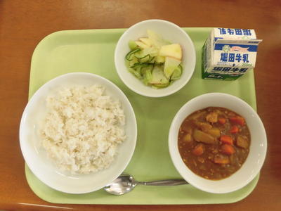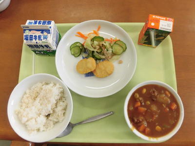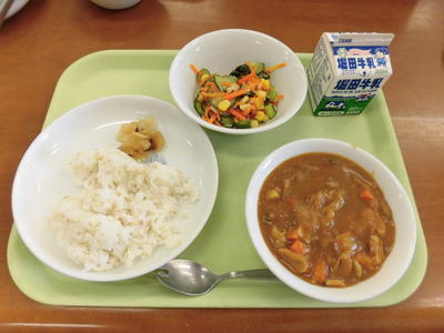 今日の給食は、牛乳、秋味カレーライス、にんじんと枝豆のチキンサラダ、福神漬けでした。