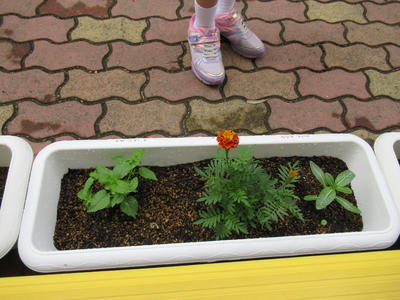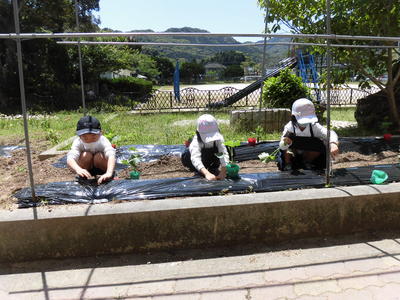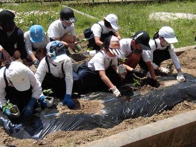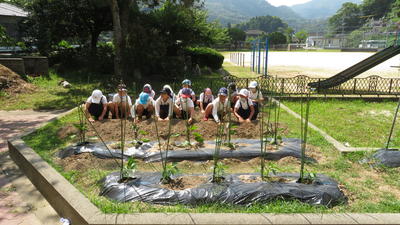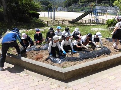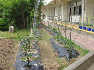 連休中、3年生の保護者の岩下さんが花壇を耕して、マルチも張ってくれました。