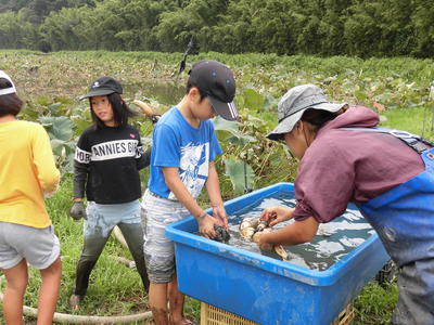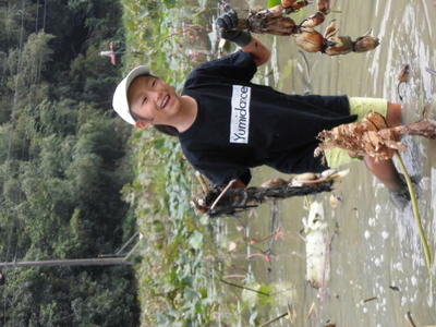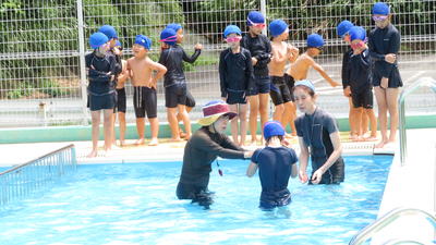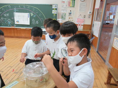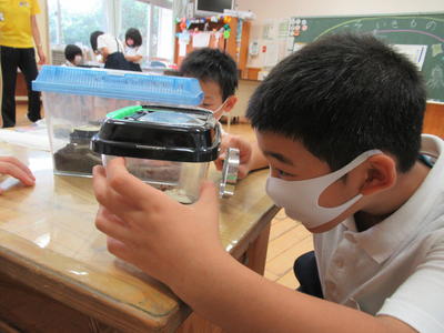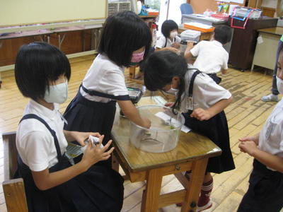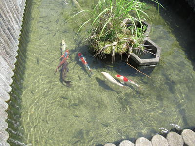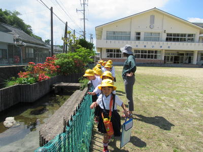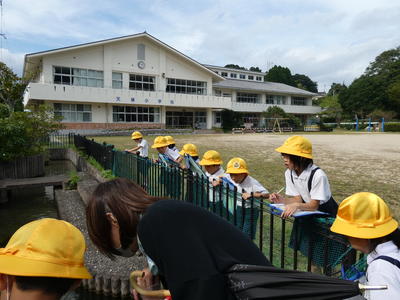 5時間目は、1年生が池の鯉やカメを観察しました。鯉は何匹いるでしょう?15匹いました。カメは3匹です。