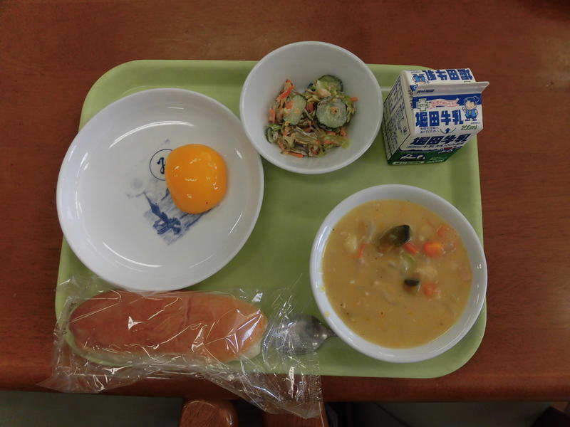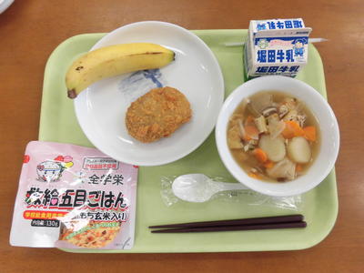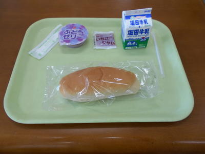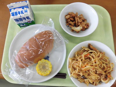 今日の給食は、カボチャパン、牛乳、魚オリーブ焼き、コーンスープ、バナナでした。