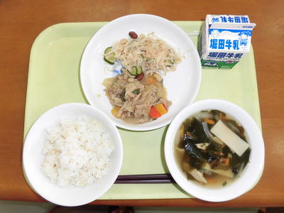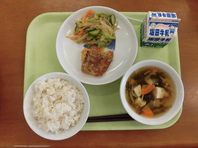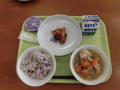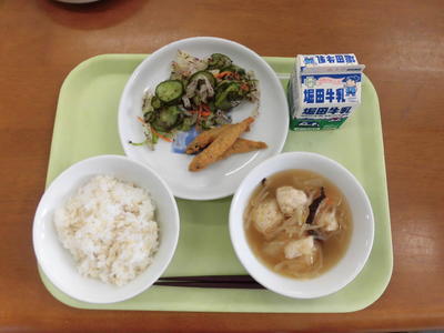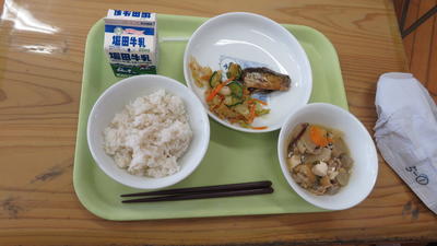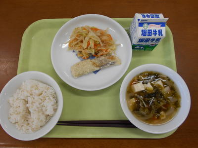今日の給食は、麦ご飯、牛乳、魚とサツマイモの甘酢あん、たぬきじる、茎わかめの佃煮でした。