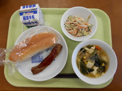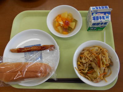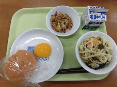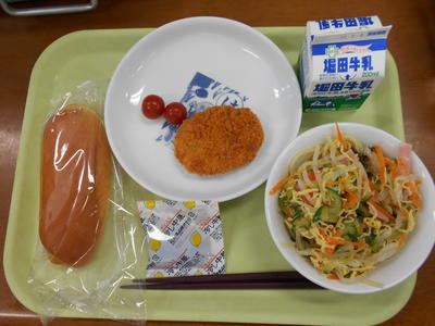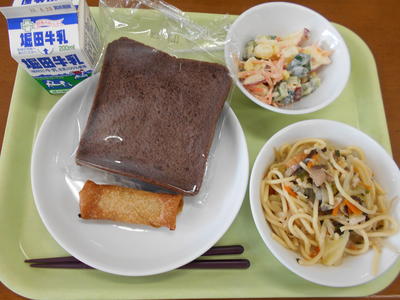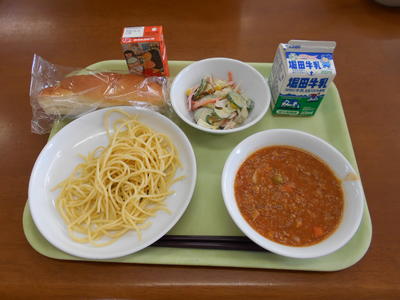 今日の給食は、ミルクパン、牛乳、みかん果汁、ゴボウサラダ、スパゲッティミートソースでした。
