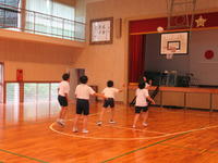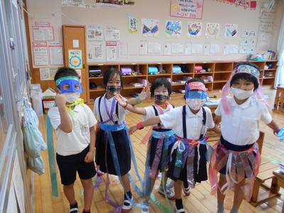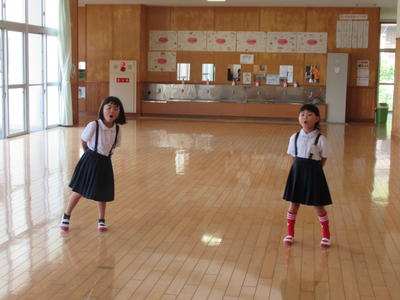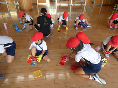 低学年ダンス。衣装あわせをしました。手袋をして、足下にはリボンの鈴、頭はバンダナ、をつけます。保護者の方、当日はつけるお手伝いをお願いします。