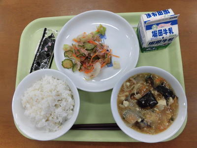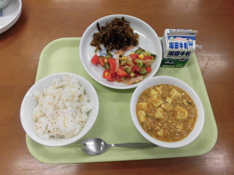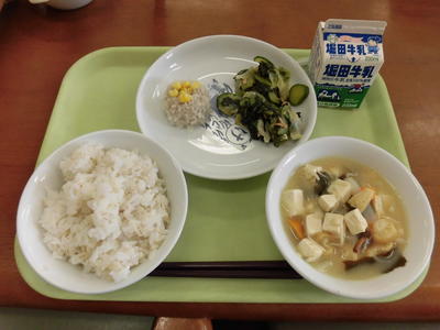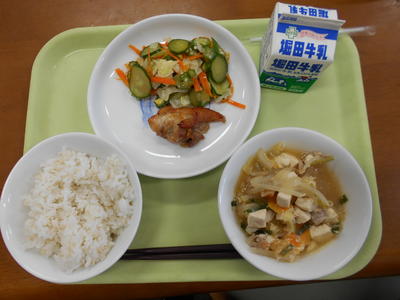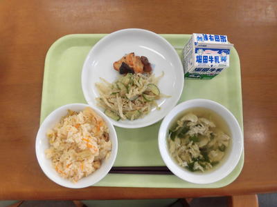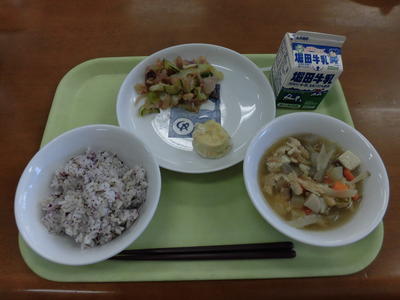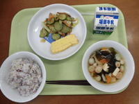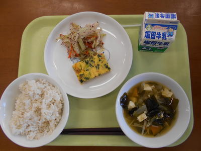 今日の給食は、麦ご飯、牛乳、ちぐさやき、すまし汁、ゆかりあえでした。