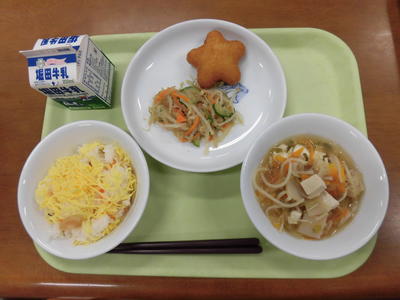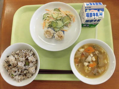 今日の給食は、ゆかりごはん、牛乳、さら玉サラダ、けんちんじる、シュウマイでした。