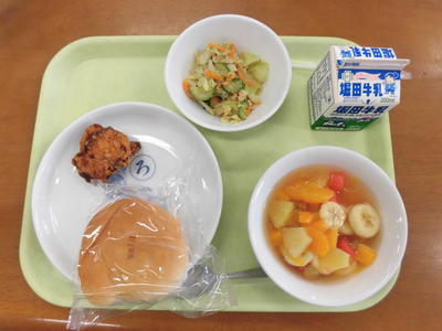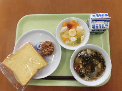 今日の給食は、カボチャパン、牛乳、魚ロッケ、フルーツカクテル、もずくスープでした。