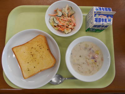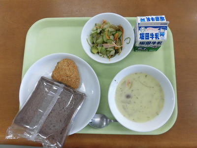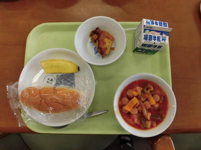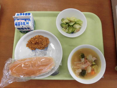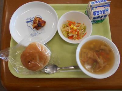 今日の給食は、米粉パン、牛乳、鶏肉マーマレード焼き、あっさりサラダ、ビーンズスープでした。