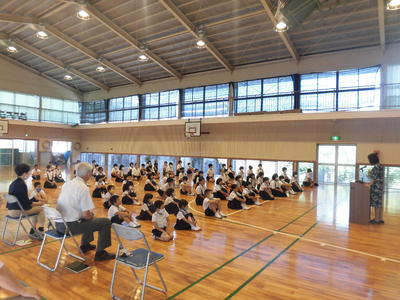 今日は、3時間目までしたら、給食を食べて避難をしました。その後、運動会の結団式をしました。
