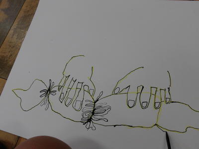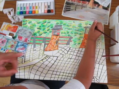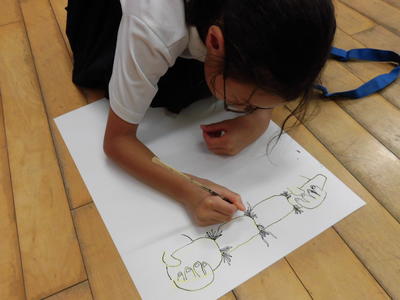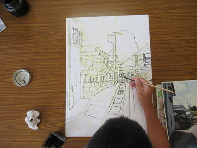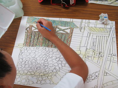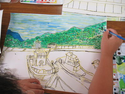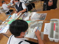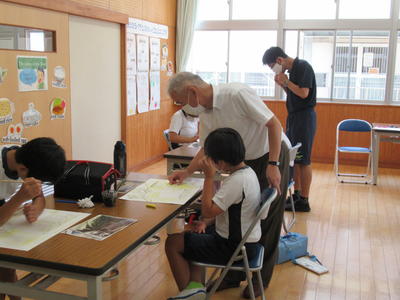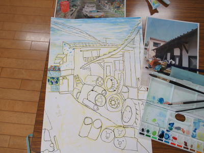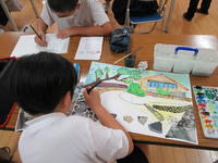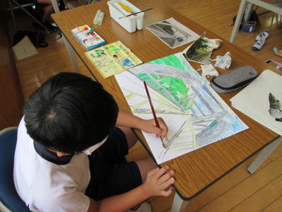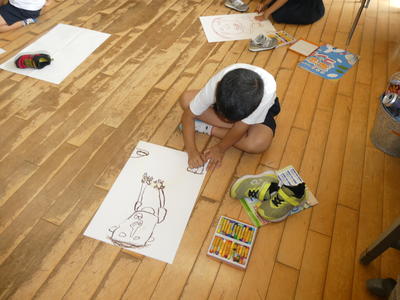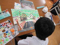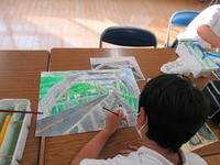 1年生がタイヤ跳びの絵を描いています。