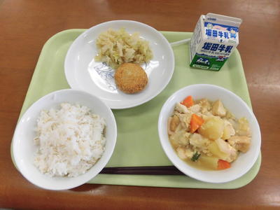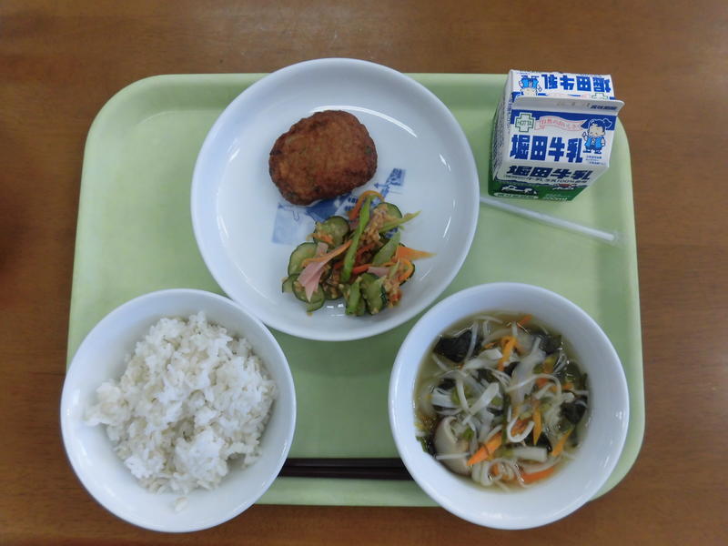 今日の給食は、麦ご飯、牛乳、親子煮、大豆とゴボウのメンチカツ、ゆでキャベツでした。